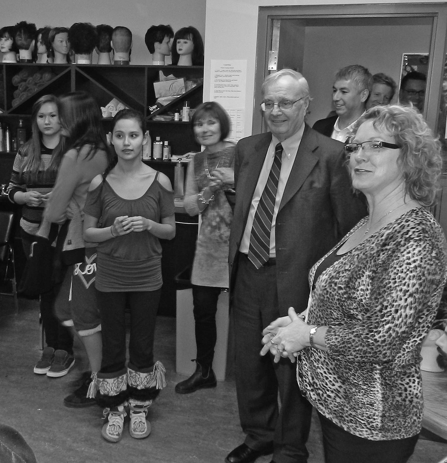 Cosmetology students and their instructor Debbie Brown were thrilled when the Right Honourable Paul Martin toured their classroom, Chopper’s Hair Salon, just prior to Seniors Day. Mr. Martin was visiting FNSS to launch his new Aboriginal Youth Entrepreneurship Program. Photos by Kathy Smith and Debbie Brown