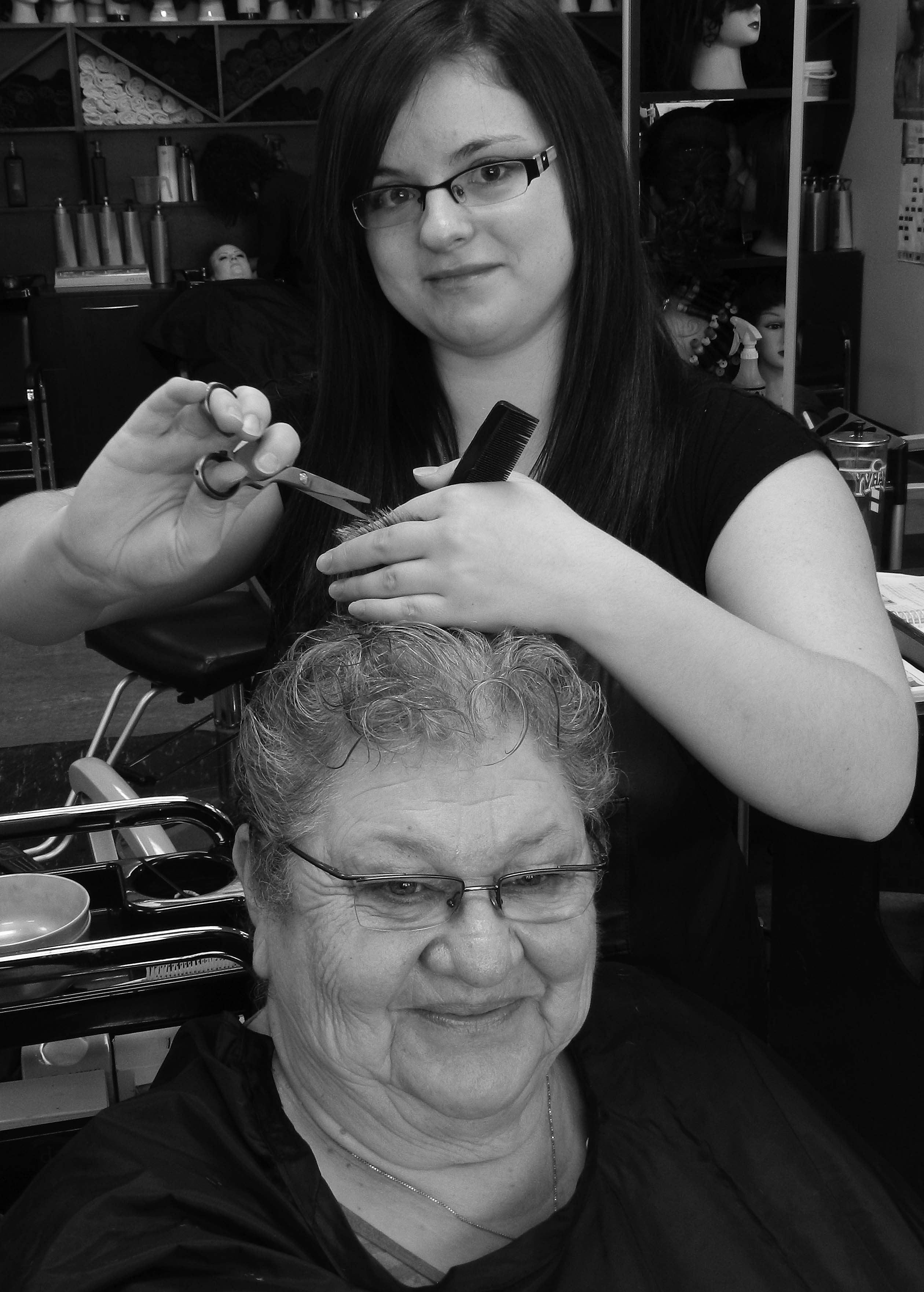 The FNSS Cosmetology students treated six seniors (ladies and gents) to hair services in Chopper’s Student Hair Salon. Back row: students Isabelle Lane, Kendra Parker, Kelsey Clarke, Jessica Zegnal, Instructor Debra Brown, Community Links and FOR Club Coordinator Kanta Reddy, students Kaitlin Turko, Kaitlyn Ganson, and Samm Tollifson. Front Row: students Katelyn Piszar, Sarah-Mae Perry, and Kasey Smith. The Rachel’s Challenge FOR Club and the Cosmetology program coordinated the event. .