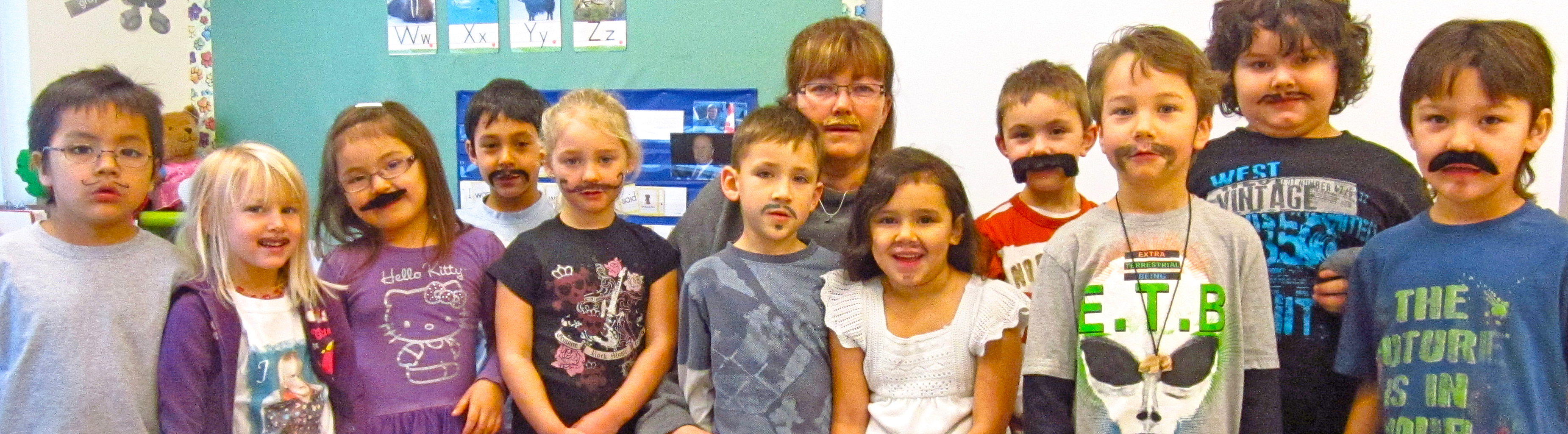 The Chalo School kindergarten class in their mustaches; teacher Jeanie Kenneway with Martin Duntra, Jaime Childs, Paiton Tsakoza-Brenton, Jack Bonn, Julianna Otsig, Robert Thomson, Athena Michel, Carson Matheson, Jessie Cote-Quock, River Michel, and Leon Thomson.