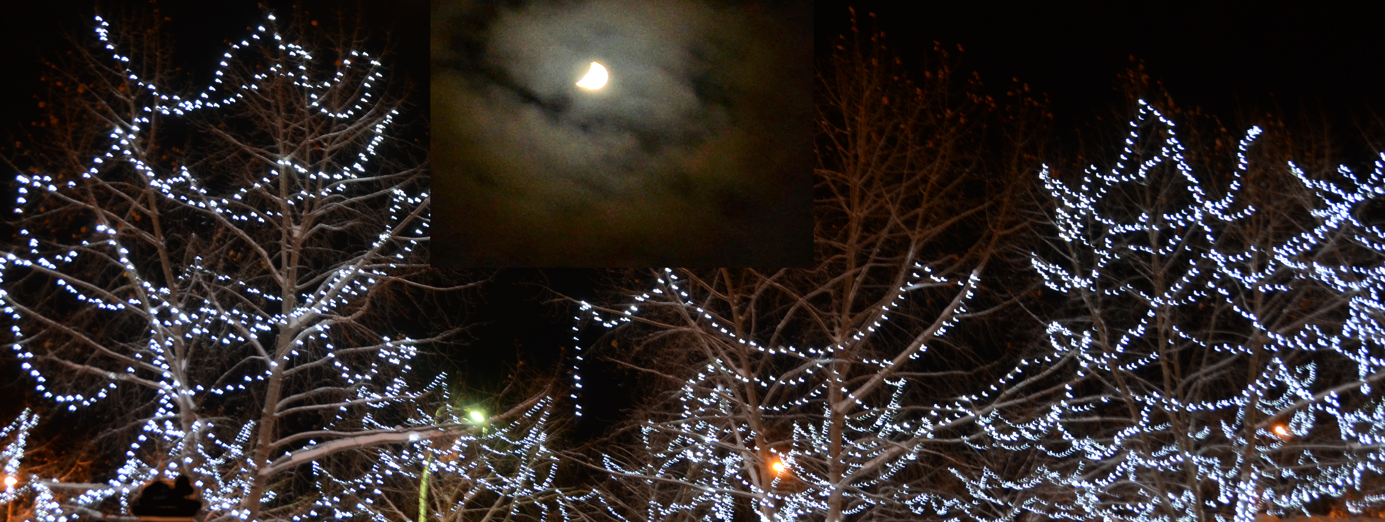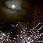 The moon over Christmas lights on the Alaska Highway