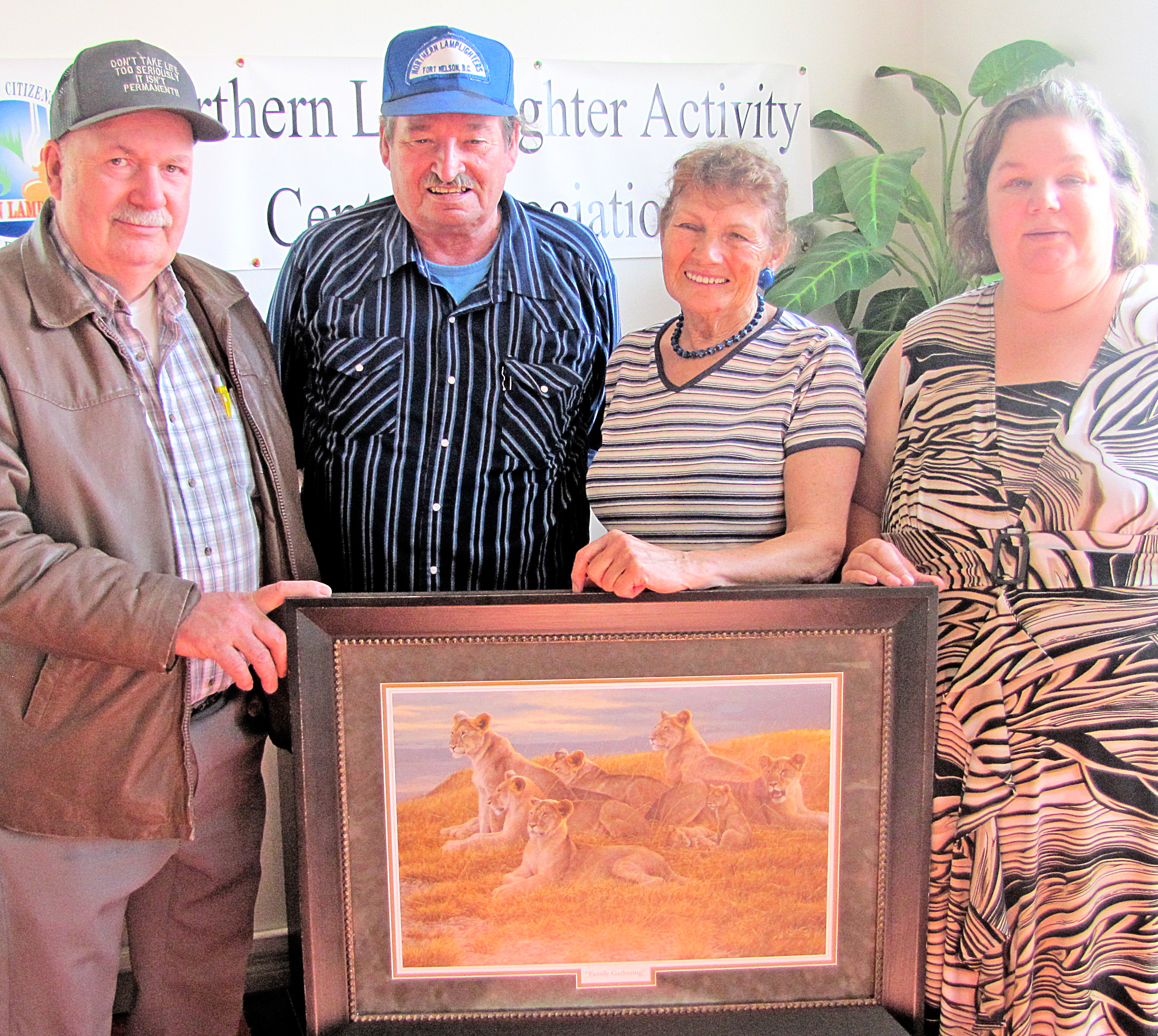 The Northern Lamplighters Association just held a fundraiser raffle of three donated prizes. The grand prize was the picture shown above, donated by Jim Cobbett, and was won by Colin Rhead. NAPA donated a hammer drill and a drill, which were won by Marlene Johnson, and Ed Kenny respectively. Grand Prize winner Colin Rhead (left) accepts his winnings from with longtime Lamplighters member Pat Wainwright, President Mavis Brown, and Executive Director Kathleen Olson.
