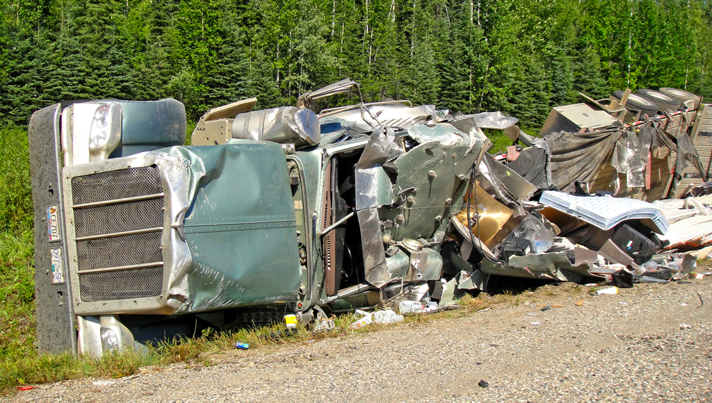 On Saturday evening this lumber truck was involved in a single vehicle accident while travelling southbound toward Fort Nelson on the Alaska Highway. BC Ambulance attended, however, there were no injuries. This was one of three accidents reported over the holiday weekend. A single vehicle hit a moose by Buckinghorse with no injuries, and another accident involved a tractor trailer and a pickup truck on the Patry Mainline. The driver of the pickup was medivaced to Edmonton with non-life threatening injuries, while the tractor trailer driver was uninjured.