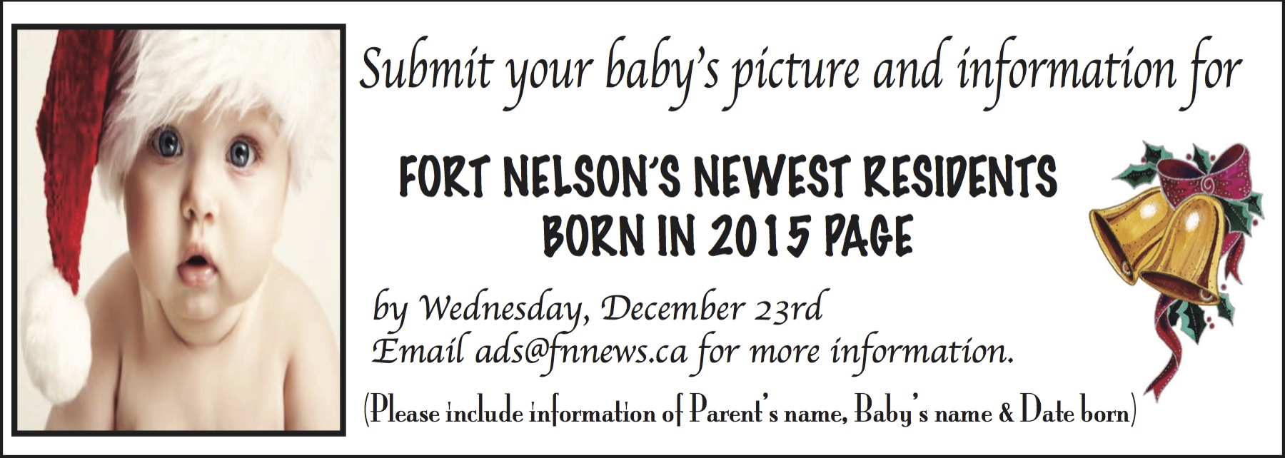 Submit your baby’s pictures and information for the Fort Nelson Newest Residents Born in 2015 Page, by Wednesday December 23rd.