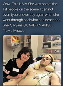 She has been overwhelmed by the impact that Ryan and his family have had on her. “This kid was laying there, his legs are paralyzed and he has a broken clavical and neck and couldn’t move his arm, but after I gave him my necklace as a gift, with his only good limb he reached up and hugged me. The family is just a beautiful family, really positive, and he’s really positive.”