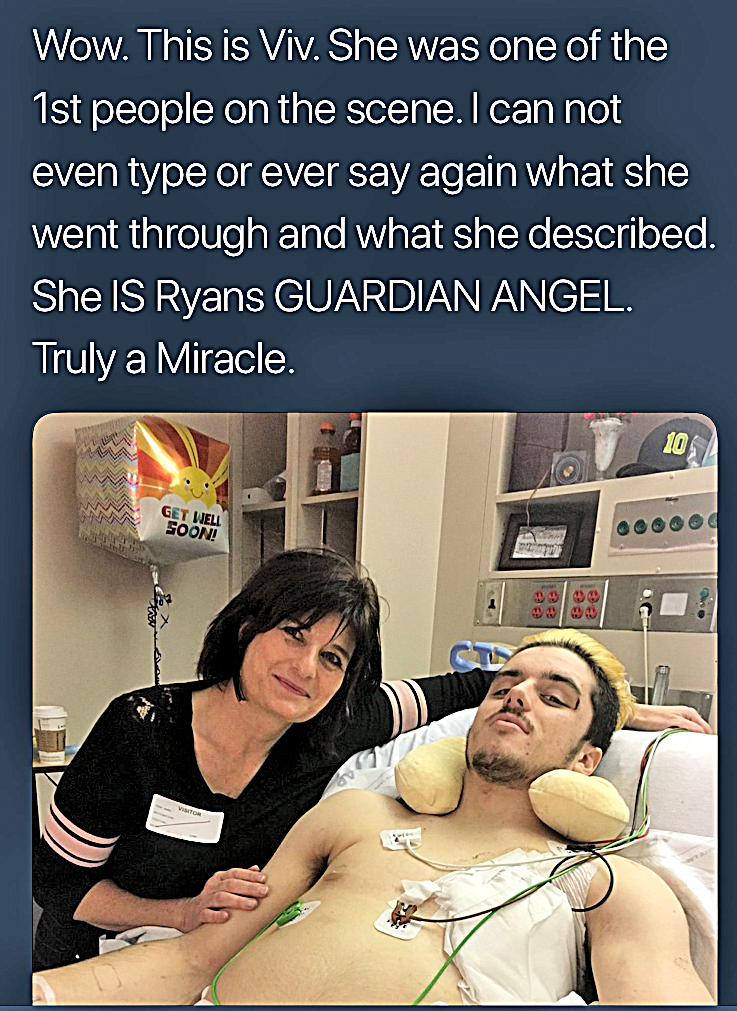 “I noticed Ryan was alone and didn’t have any blankets.  I went to assess him and he was conscious, and alert and we talked while we waited. He said he knew he was paralyzed. He had his hands in his lap, I could tell he was in a lot of pain and he asked to be laid down and I said I couldn’t lay him down because he might have an unstable fracture. He just listened to me, he did everything I told him to. He wasn’t screaming or freaking out. His bare back was laying against the frame of the trailer. He had a shirt on, but it was pulled up. We got a blanket behind him and another bystander who identified herself as having first aid training came with a rolled towel that acted as a neck brace.